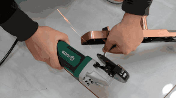 由于切割后,插栓的边缘还会出现一些毛刺以及细微的突起,如上是完成切割后进行进一步打磨,这个时候世达角磨机就可一步到位。