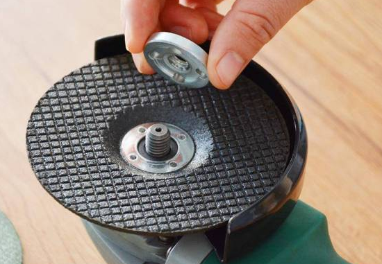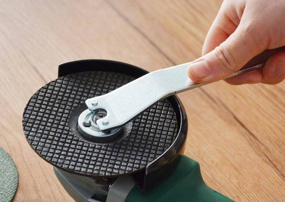 第二步:安装砂轮片或者切割片;在安装时需要检查上发兰是否与磨片接触面接触好,并用扳手将其旋紧固定。