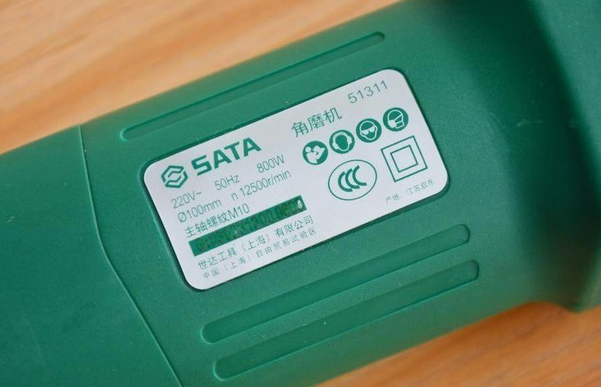 位于机身对称的另外一面,贴有世达角磨机的基本信息,包括支持220V-/50Hz的交流电压,整机功率为800W、额定转速为12500r/min等参数。