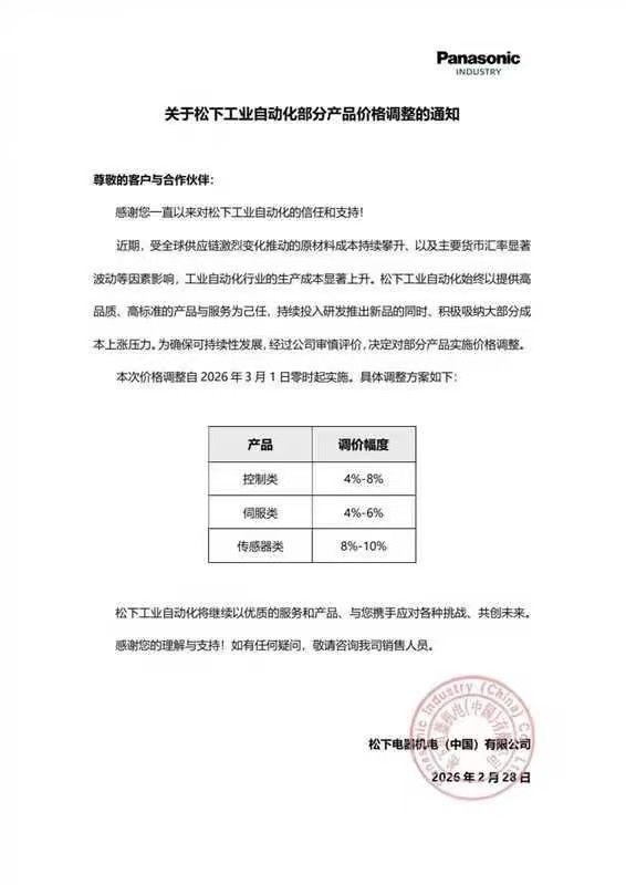 松下:2026年3月1日起,控制类涨价4-8%,伺服类涨价4-6%,传感器类涨价8-10%。