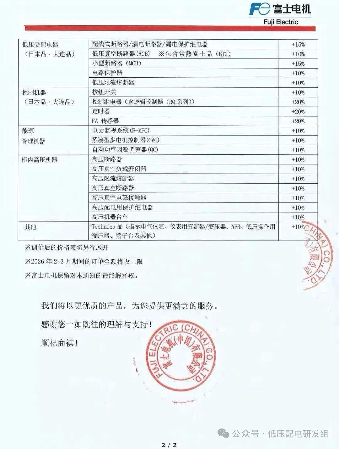 富士电机:2026年3月3日起,低压配电类涨价10%。