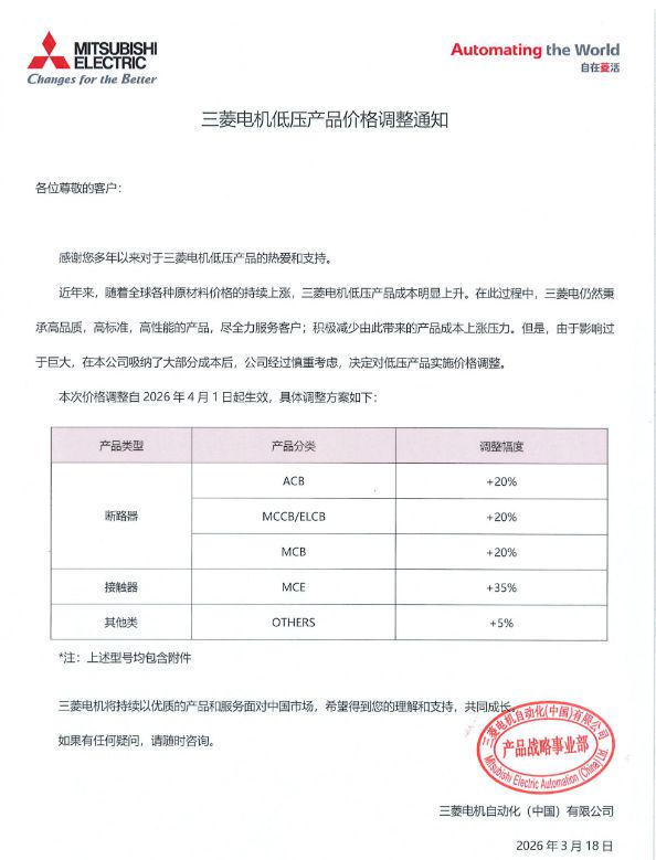 三菱电机:2026年4月1日起,低压配电类涨价5-35%。