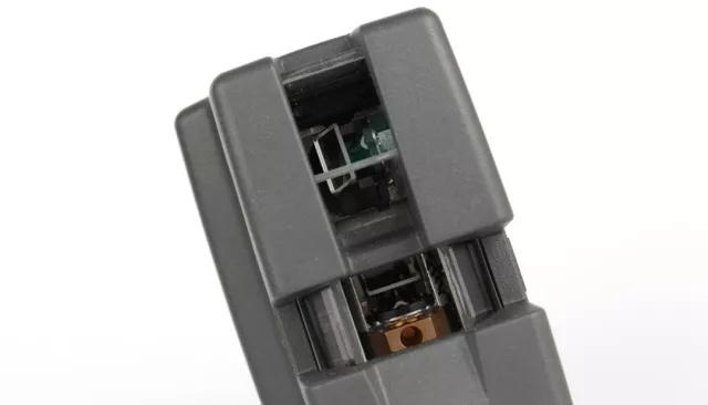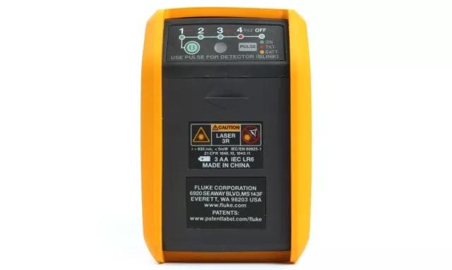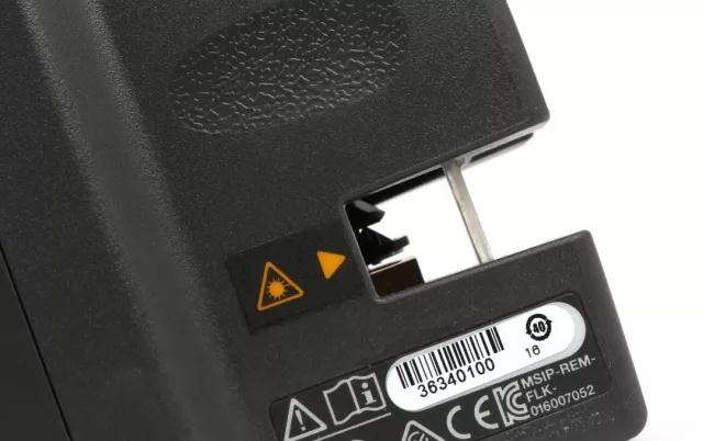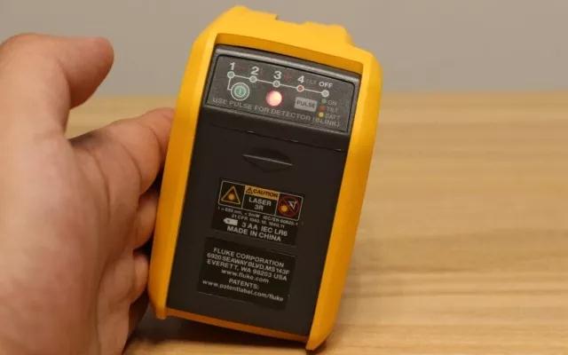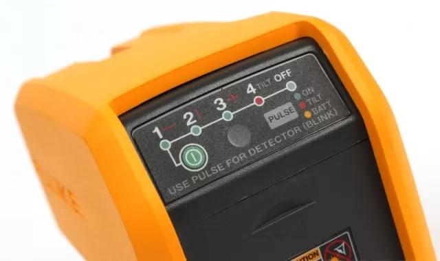 水平仪的按钮特写,FLUKE-180LR在操作步骤十分简单,开启开关为单一水平激光束,再次按开关开启垂直激光束,第三次按下开关水平激光和垂直激光同时开启,第四次按下开关时启动水平仪的手动调平模式,第五次按下时水平仪关机。开关键右侧还有一个PULSE按键,这个按键可以切换激光束的亮度,只有两个档位可以调节。