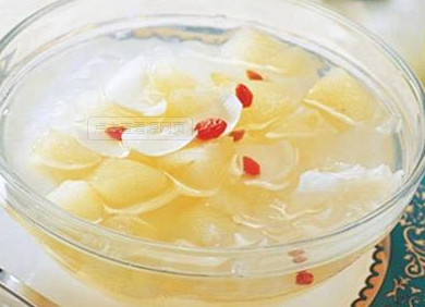 做法:雪梨洗净,带皮切成小块,百合洗净。将雪梨块和百合放入锅中,倒入清水,大火煮开后,撇去汤面的浮沫。然后盖上锅盖,露一条小缝,调成小火,煮20分钟后,放入洗净的枸杞,再煮2分钟就OK了。