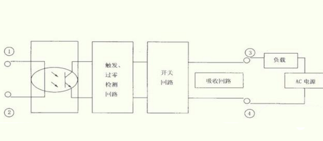 它是四端有源器件,工作原理图如下图所示的1和2是输入端子,3和4是输出端子。当在其输入端子施加合适的控制信号时,输出端的状态由断到通,当输入端子的控制信号撤销时,它的状态又恢复断开状态。根据它的工作原理图可知;它采用隔离输入、输出之间的联系,利用光耦进行的。耦合回路的信号在触发回路产生符合要求的触发信号。当控制信号加入,等交流电过零时,输出端状态由断变通。当控制信号消失,等交流电的正半周期与负半周期的交界点时,输出端状态恢复为断状态。看图中有个触发过零检测回路,用过零检测目的是控制开关电路在断开时不产生射频干扰,避免从负载电源中传来尖峰,浪涌电压对固态继电器的干扰。