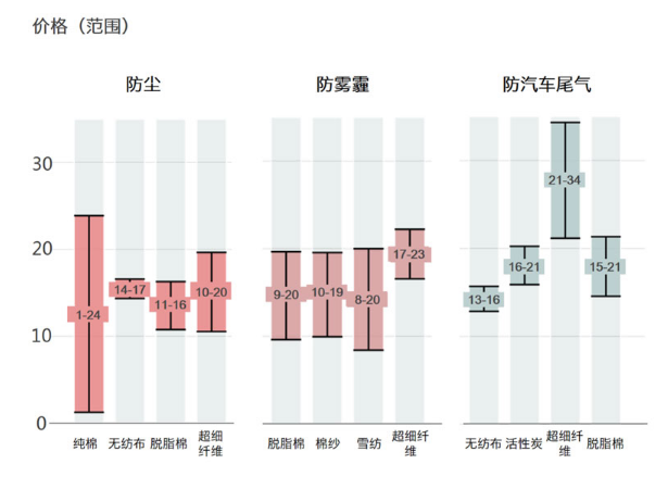 生活在十面“霾”伏的城市,大家最发愁就是口罩能否防霾。除了防雾霾之外,出现频率较高的功能为:防尘、防雾霾、防汽车尾气、防病菌、防甲醛等。通过比较了三个热门功能的口罩材质类型和价格,发现纯棉的防尘口罩价格区间跨度最大,防雾霾口罩的价格时间大多在10到20,超细纤维材质的价格较高。相对专业的防汽车尾气口罩 ,最低价格高于其他两个类型,其中超细纤维材质的价格最高。
