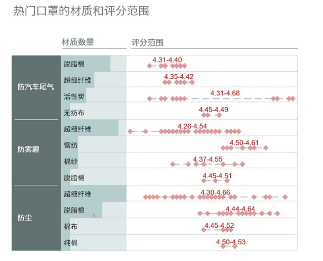看完了价格和材质,网购经验丰富的小伙伴们一定不会忘了看看评价情况。在防汽车尾气功能的口罩中,评分较低的脱脂棉材质数量最多,无纺布的评价差异小且高。活性炭也是常用的材料,然而评价褒贬不一。脱脂棉在防尘口罩中是常用材质,评分高,然而用作防雾霾口罩的数量和评分相对较少。其中,棉布材质口罩佩戴舒适,透气性好,无纺布材质可以有效的防尘防菌,活性炭层可以能过滤装修残留的甲醛等有机异味,让呼吸更清新,但呼吸阻力也会随之增加。最后提醒大家,在这个雾霾横行的时代,大家一定要及时戴上合适的口罩保护健康哦~